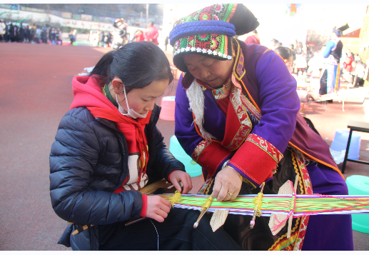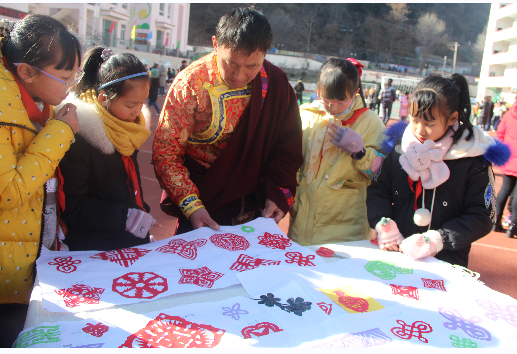 该校高度重视非遗进校园活动的开展,遴选了一批具有地方特色的羌绣、藏织、剪纸、羊皮鼓、嘉绒原生态锅庄等非遗项目,充分依托乡村学校少年宫,成立学生兴趣小组,积极开展传承活动。