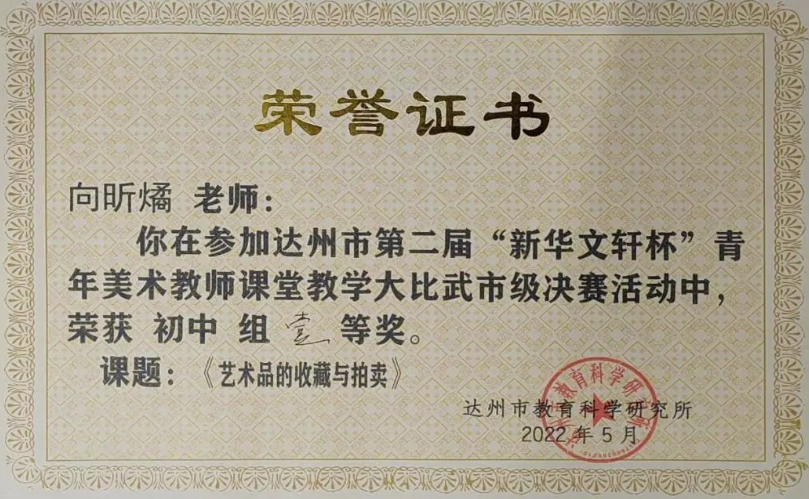 本次比赛共分高中组、初中组和小学组,参赛选手各展其能,课堂环节精彩纷呈,全面展现了达州市青年美术教师的亮丽风采。最终,来自达州中学的美术教师向昕燏脱颖而出,在此次大比武活动中勇夺一等奖第一名。