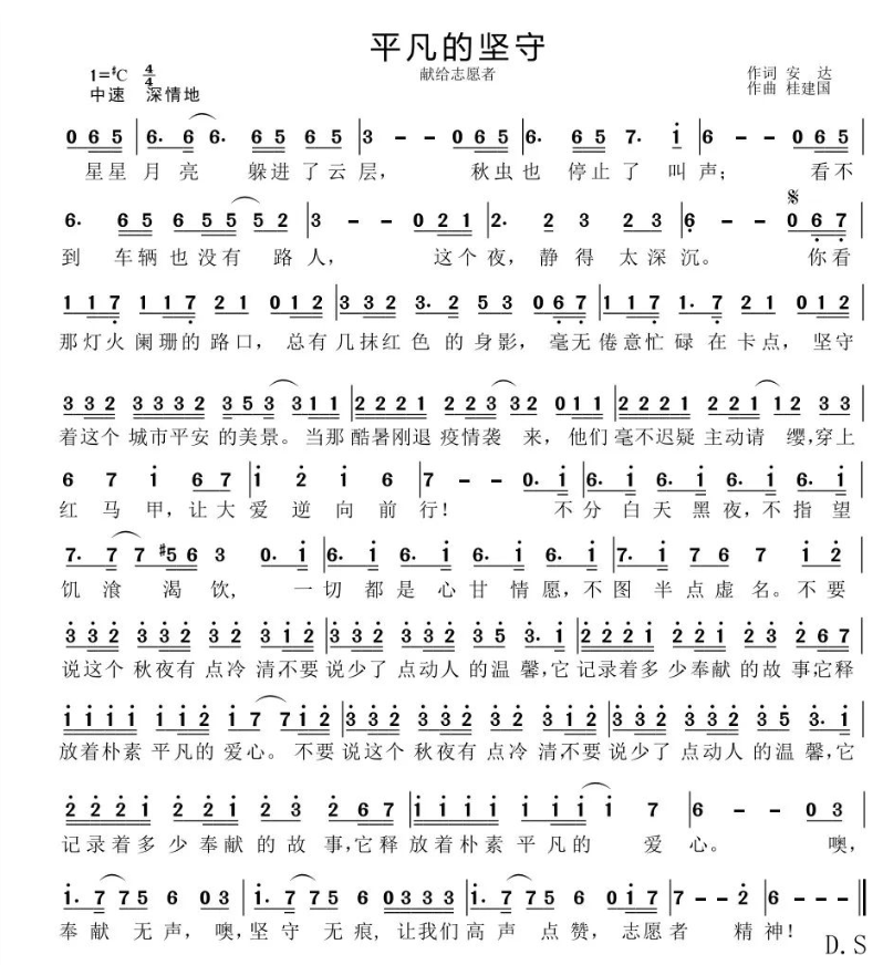 谈到创作初衷时,桂建国老师表示:“九月以来,包括达州在内的中国多个地区再次遭受疫情的肆虐,我们再次处在了疫情的中心地带,不能出门,不能逛街,不能工作,城市仿佛被静默了,一切都按下了暂停键,我们从没有像这样失落与伤心。突然,窗外飘来了一抹红色的身影,他们带来了食物,带来了用品,带来了希望,也带来了党的殷切关怀,让我们的希望重生。我们不再失落,不再伤心,因为窗外到处是中国红,因为窗外到处是志愿者,他们不畏艰辛,不惧病毒,奋战在抗疫第一线,这首《平凡的坚守》,唱出了我们的心声,歌颂他们,鼓励他们,祝福他们,我们最亲爱的志愿者同志。”