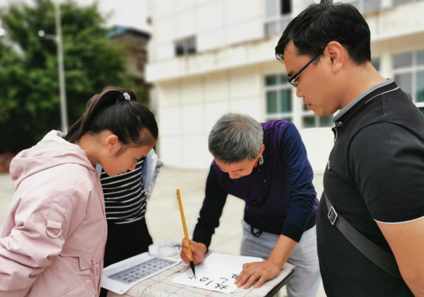 学校书法教师李佳嵘老师辅导学生时即兴挥毫,墨随笔趟,行笔中锋,一手流畅的柳体楷书展现眼前,点画爽利挺秀,骨力遒劲,结体严紧,获得在场师生一致好评!学校美术老师张桂仙、王艺颖、蒋淑惠、朱俊辉老师也纷纷走入赛场耐心为同学们指导书写。