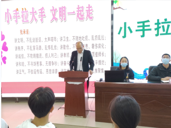 全体师生跟随领誓人庄严宣誓:“讲文明,不乱说脏话、大声喧哗;讲卫生,不随地吐痰、乱扔乱拉……”宣誓声铿锵有力、响彻云霄。会上,学校对评选为“德育标兵”的同学进行了表扬。