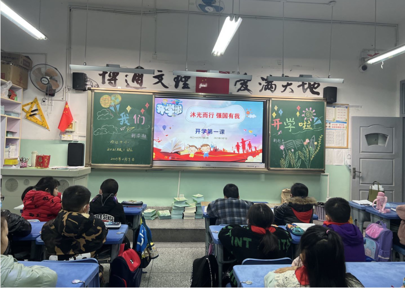 2月7日上午,内江市第十小学校举行2023年春季学期“童心筑梦二十大 追光少年向未来”开学典礼,典礼在室内举行,各班学生在班级内共同迎接新学期。