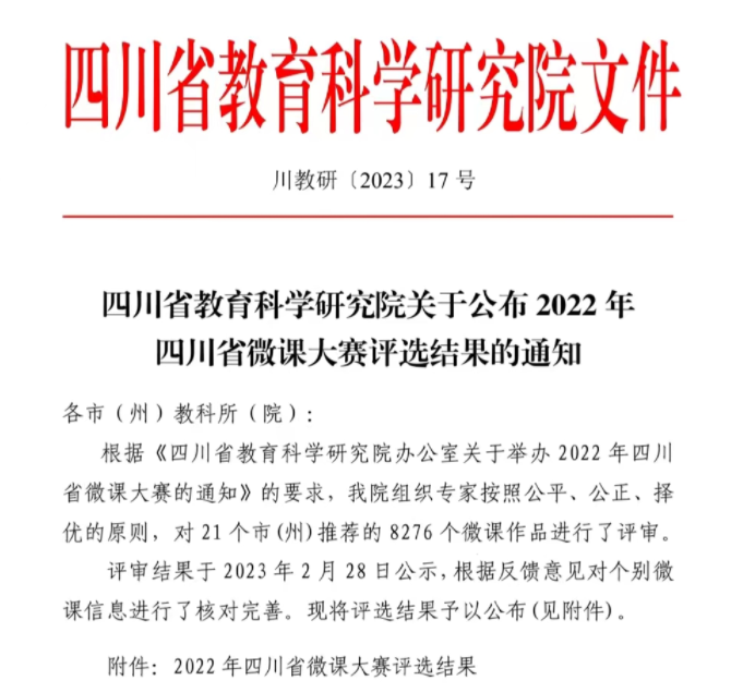 见“微”知著,以“微”见长。近日,四川省教育科学研究院公布了2022年四川省微课大赛评选结果。达川中学共有11名教师获奖,其中,税礼、黎真利、寇兵老师荣获一等奖,陈首旭、郑泽申老师获二等奖,杨孝仁、易盼、王灿辉、侯莉、袁芳、刘宗平老师获三等奖。