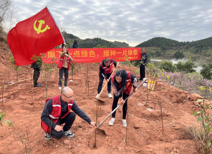 阳春三月,李花白,桃花红,樱花粉,海棠美,蜜蜂忙……为深入贯彻落实习近平总书记生态文明思想,践行“绿水青山就是金山银山”理念,中共广汉市宏华外国语学校党总支部组织党员志愿者开展了“义务植树”主题党日活动。