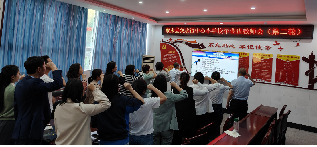 会上,科研室主任就“毕业班复习问题”向老师们做“博观而约取,厚积而薄发”的主题交流。对六年级教学工作现状进行总体分析,并从复习计划、班级管理、优化课堂、提质增效等方面为教师们带来宝贵的经验。随后,党支部书记、校长郑宇对近期老师们的工作给予充分肯定,并指出今后努力的方向,希望毕业班教师齐心协力,统一思想,增强信心,在提升质量的同时关注学生心理动态,让学生健康快乐地成长。最后,全体教师庄严宣誓,为了叙小更加辉煌的明天,立下决心。