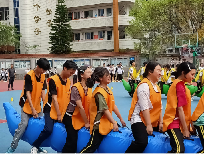 趣味运动会设置了背夹球、无敌风火轮、袋鼠跳、巨人脚步、一圈到底、旋风跑、毛毛虫向前冲等项目。赛场上,参赛选手全心投入,尽情挥洒汗水,释放活力,享受着运动带来的激情与快乐。他们在参与中体验顽强拼搏、奋勇争先、互帮互助、团结协作,场下观众们热情高涨。校园里,加油声、欢呼声、呐喊声此起彼伏,无论是比赛场上还是观赛场,大家脸上都洋溢着灿烂的笑容,共同享受着趣味运动带来的乐趣。