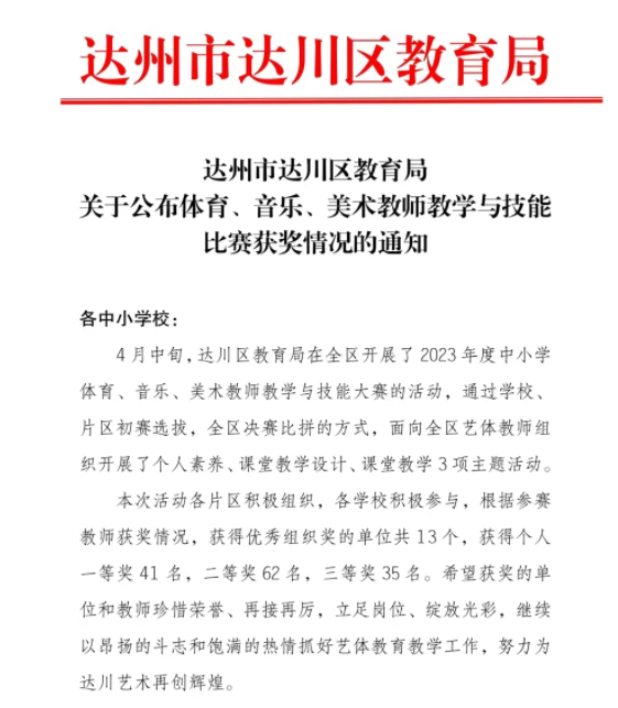 近日,达川区教育局公布了获奖情况。其中,达川中学体育学科初中组参赛老师郎佳凤获得一等奖,高中组参赛老师汪厚全、郭小沅老师分别获得一等奖;音乐学科初中组参赛老师周向娟获得二等奖;美术学科初中组参赛老师龚小艺获得一等奖,高中组参赛老师杨丹获得一等奖。