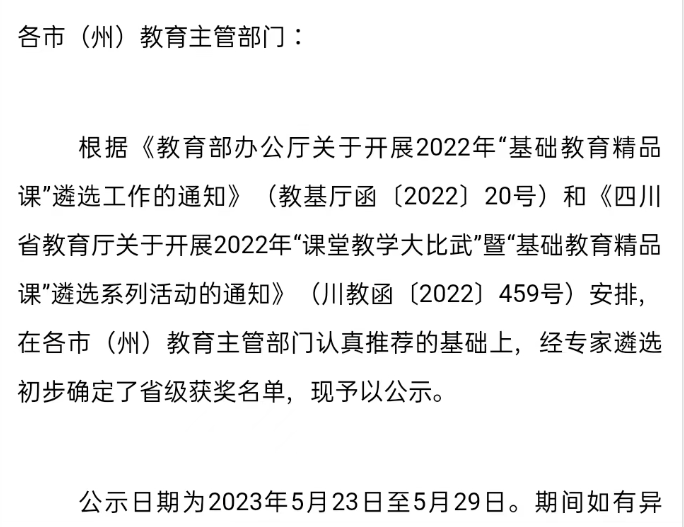 近日,四川省教育厅公示了关于2022年四川省“课堂教学大比武”暨“基础教育精品课”遴选活动获奖名单,达川中学4名教师获奖——