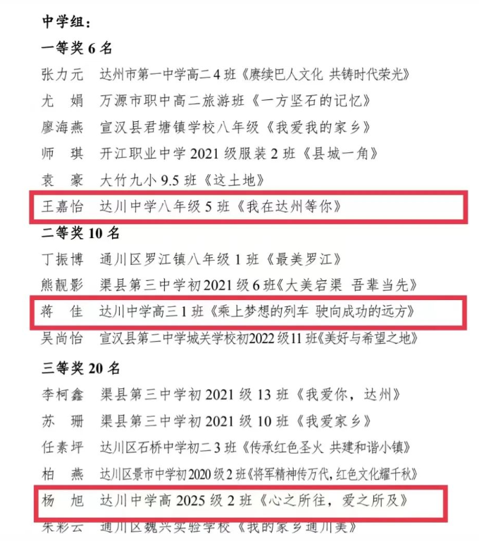【!祝贺他们!】 多年来,我校大力推行书香校园活动,在多项征文大赛所取得了优异成绩。同学们在阅读中提升语文素养,在写作中感知生命张力,在生活中成长进步。 希望获奖同学再接再厉,学习贯彻党的二十大精神,在全市形成爱我达州、团结奋进的良好氛围,为建设达州“一区一枢纽一中心”作出新贡献!(杨丹)