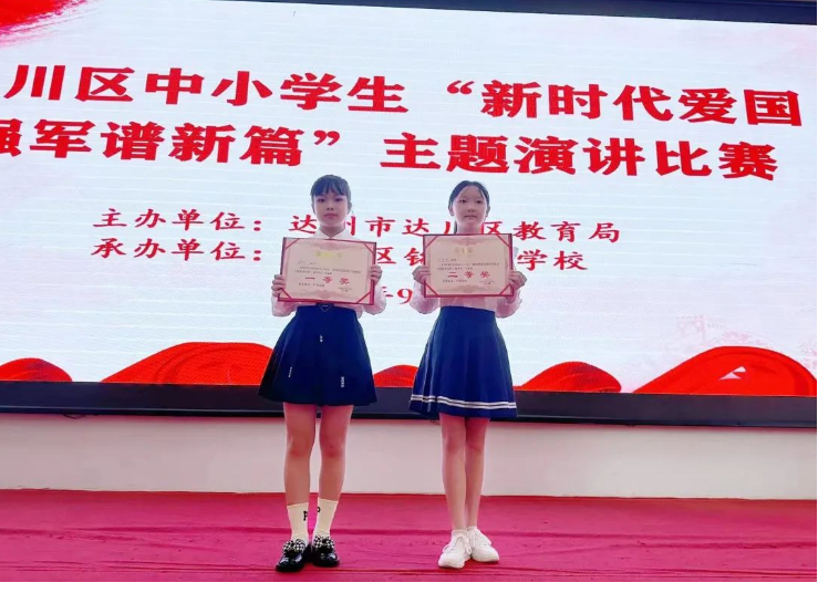 9月19日,达川区中小学生“新时代爱国强军谱新篇”主题演讲比赛在达川区铭仁园学校举行。达州中学唐艺丹同学的《牢记历史 心系国防》获得一等奖第一名;邓梦琴同学的《厚植强军思想 争做爱国少年》获得二等奖第三名。