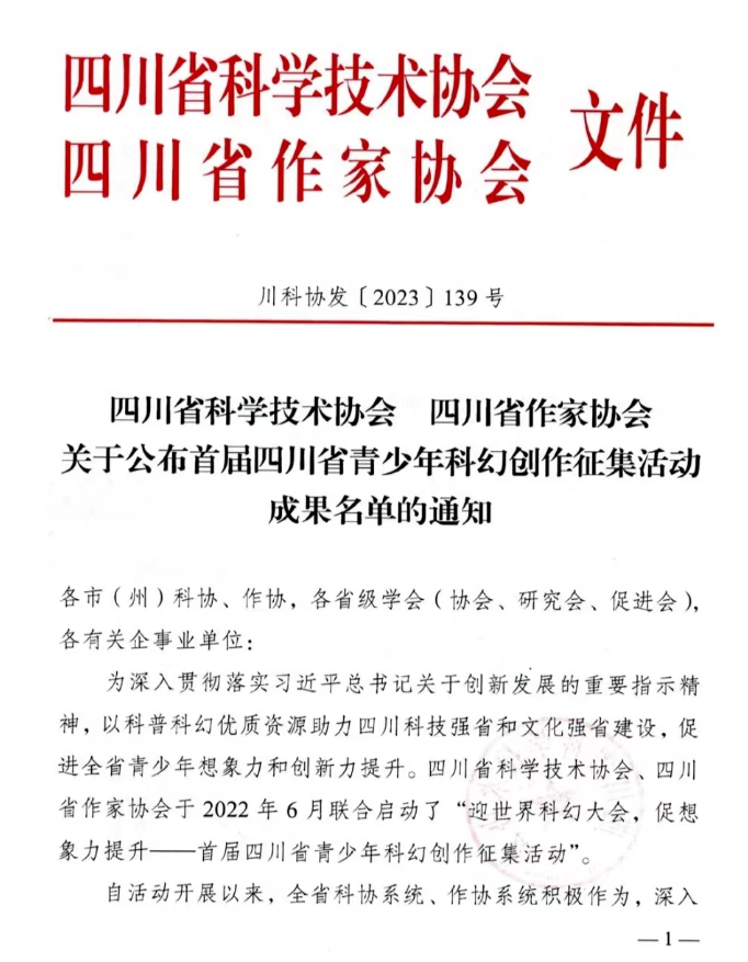2022年6月,四川省科学技术协会、四川省作家协会联合启动了“迎世界科幻 促想象力提升——首届四川省青少年科幻创作征集活动”。经专家评审委员会初审、复审、终审三轮评选,共评选出“入选作品”4633个、“优秀作品”1765个、“最佳作品”220个、“表现优秀的组织单位”13个、“四川省想象力教育工程基地”38个、“表现优秀的指导教师”181名。达川中学学生积极参与,教师认真指导在本次活动中,四川省达川中学荣获首批“四川省想象力教育工程基地"!杨丹老师和龚小艺老师分别指导的吴涵宇同学和袁可思同学的绘画作品获得“最佳作品"奖。