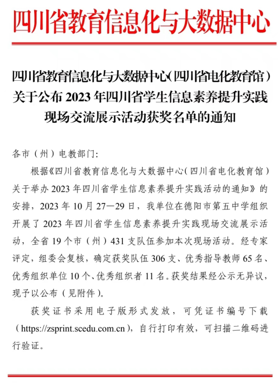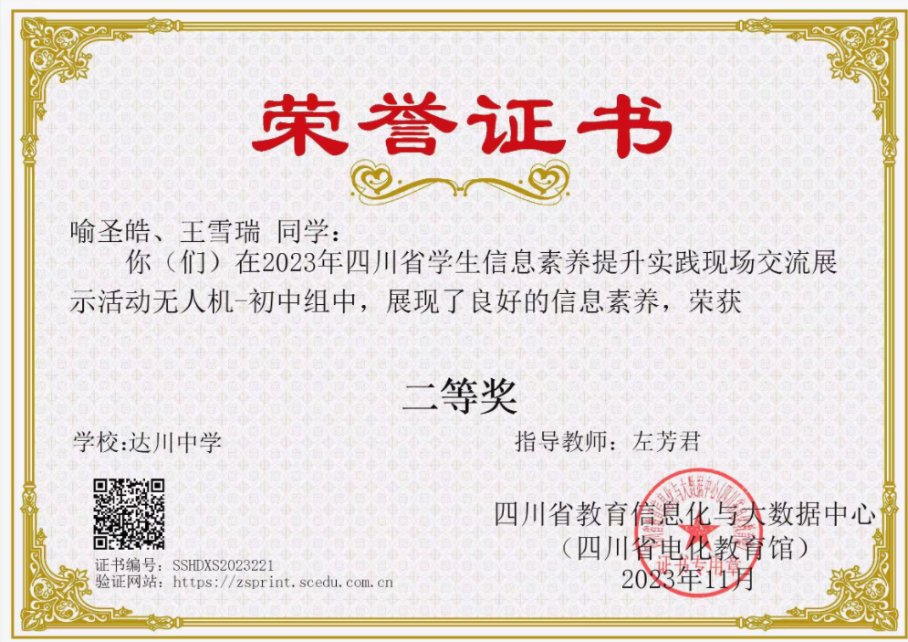 近日,四川省教育信息化与大数据中心公布了2023年四川省信息素养提升实践现场交流展示活动获奖名单,达川中学共有4名学生在展示活动“无人机-初中组”获奖。喻圣皓、王雪瑞同学两位同学获得二等奖,袁雅涵、刘传峰同学获得三等奖。