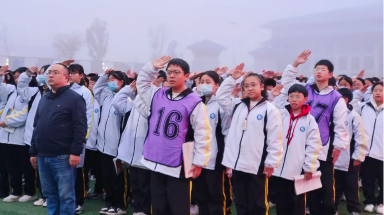 伴随着雄壮的国歌声,鲜艳的五星红旗冉冉升起,全体师生整齐列队,庄严肃立,面向国旗行注目礼!