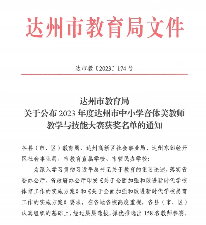 近日,达州市教育局公布了2023年度中小学体育、音乐、美术教师教学与技能大赛结果。四川省达川中学4名教师凭借过硬的基本功、稳定的发挥、出色的表现,喜获佳绩,2位老师荣获一等奖,1人荣获二等奖,1人荣获三等奖。