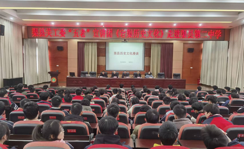 为帮助师生了解家乡历史文化,厚植家国情怀,赓续历史文脉,2023年12月28日,渠县第二中学特邀渠县关工委“五老”宣讲团举办宕渠历史文化讲座。