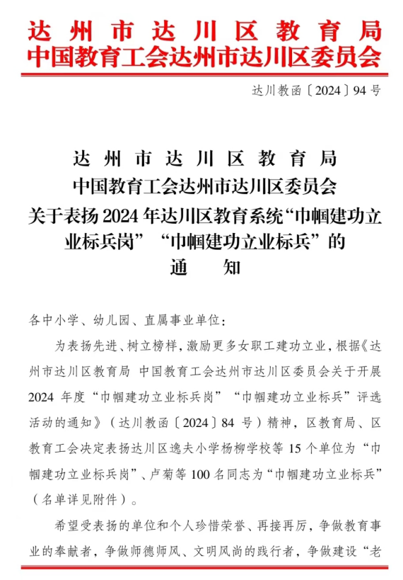 近日,达州市达川区教育局和中国教育工会达州市达川区委员会联合公布表扬 2024 年达川区教育系统“巾帼建功立业标兵岗”和“巾帼建功立业标兵”文件,达川中学唐红、李媛媛、郭晓琴 、王惠四位教师荣获“巾帼建功立业标兵"称号。