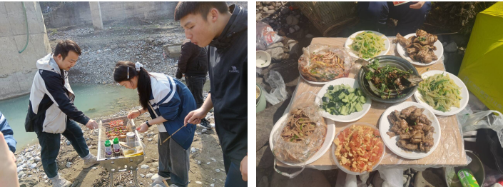 到达目的地之后,同学们在老师和家长们的指点下,开始了分工明确,有的负责清洗食材和灶具,有的负责生火,有的负责掌勺,有的负责烧烤,个个都撸起袖子加油干。野炊现场烟雾缭绕又热火朝天,可他们脸上都洋溢着畅快自信的笑容,团队精神逐步升华。炊烟袅袅,大家相互配合。各种食材,在大家共同努力下,一锅锅菜式端上桌,各种火锅、烤肉、油炸串串、青青椒炒肉、各种烧烤等等。有的小组特别能干、鱼火锅、牛肉火锅等连续不断地上了四锅,且色香味都俱全。有的小组慢慢烧烤,大家边吃边聊,一阵阵欢笑紧接着传来,大家享用美食的同时感受着轻松快乐的氛围。