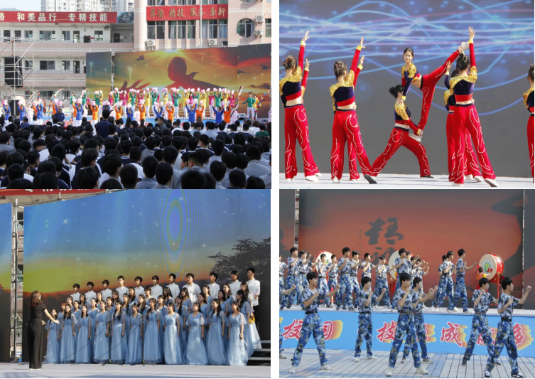 之后是场面壮阔、精彩纷呈的专业技能和才艺展演。演出分“韵律之美”序篇和“自强不息 无愧时代”“匠心筑梦 出彩人生”“挺膺担当 不负青春”三个篇章激情展开。《我们都是追梦人》自由奔跑、梦幻多彩,《如果有来生》典雅怀旧、抒情柔曼,《男儿当自强》气势恢宏、鼓声隆隆,《醉美新时代》傣家山灵、柔美婀娜,《大国工匠》身怀车技、刚柔相济,《筑梦蓝天》仪态高雅、彬彬有礼,《我要一支画笔》深情感人、寻梦星辰,《有氧二级》活跃动感、休闲舒展,《领航》红色浪漫、流云飘荡、充满力量!