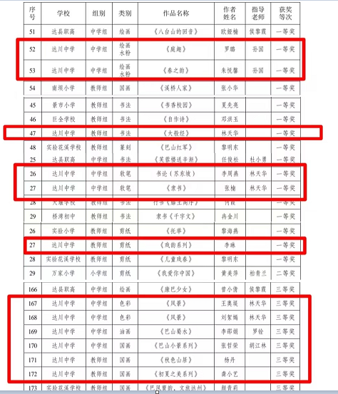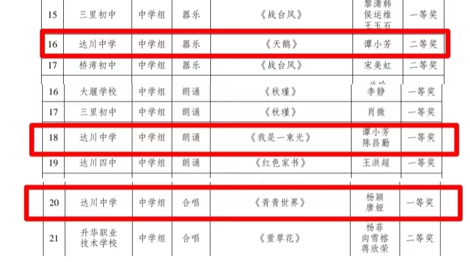 近日,达川区第四届中小学生艺术展演活动评选结果揭晓,达川中学积极组织并选送优秀节目、作品参赛,师生喜获多项佳绩且学校荣获优秀组织奖。其中,表演类节目获得2个一等奖,1个二等奖,学生艺术作品获得4个一等奖,4个三等奖。教师艺术作品获得3个一等奖,2个三等奖。李琳老师荣获本次活动“优秀工作者”。
