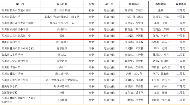 经过激烈的角逐,由达县职高教师陈力、李梦雪指导,学生王珑澄、李国郡组成的郡珑队展现出了高超的技术水平和团队合作精神,他们艰苦训练,面对挑战,毫不畏惧,凭借着扎实的训练和灵活的应变能力,一路过关斩将,最终夺得四川省青少年机器人竞赛综合技能项目一等奖。
