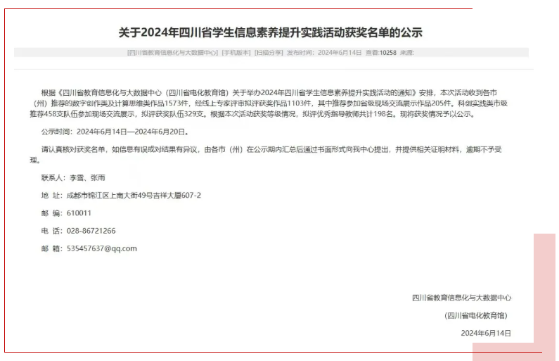2024年5月17-19日,由四川省教育厅指导,四川省教育信息化与大数据中心(四川省电化教育馆)主办的四川省第二十五届学生信息素养提升实践活动在宜宾市第四中学校举办。达川中学共有四位同学参加本次活动,并取得优异成绩。