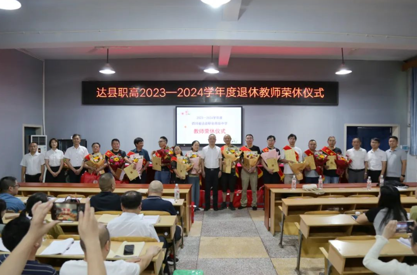 仲夏荷香远,万物皆生光。7月6日,四川省达县职业高级中学2023—2024学年度教师荣休仪式在学校大多媒体室举行。仪式由学校党委专职副书记廖飞主持。 黑发积霜织日月,粉笔无言写春秋。学校党委委员、工会主席王成介绍退休人员工作简历并深情宣读了学校给予每位退休教师的致谢词,感谢退休教师为学校发展建设付出的辛勤劳动。 薪火相传,弦歌不辍。伴随着音乐《听我说谢谢你》,青年教师深情地为退休教师献上鲜花。簇簇鲜花表达了对退休老师无限的敬意,也激励着青年教师们不忘初心,绽放芳华。 一寸丹心映杏坛,三尺讲台写华章。学校领导为退休老师赠送纪念品,党委副书记、校长胡泰然向他们颁发致谢证书,感谢他们几十年在学校改革发展中的兢兢业业、任劳任怨、尽职尽责和无悔坚守。 回首执教生涯,笑看桃李芬芳。退休教师代表张毅老师与大家分享了他在学校度过的美好时光和在工作中的点点滴滴,并为学校送上美好祝福。 一片丹心育桃李,大爱无言铸师魂。胡泰然在致辞中对退休教师们多年来辛勤耕耘在教学一线,爱岗敬业、严谨认真地工作态度和出色的工作业绩给予了高度评价,并祝愿退休老师们在退休后心情舒畅、老有所乐、幸福安康。 最后,荣休仪式在老师的祝福歌声和全体教师的依依不舍中落下帷幕。 韶华勤耕耘,晚霞别样美。感谢全校退休老师对教育事业的默默奉献,对学校发展建设的无悔付出,为学生成长的辛勤耕耘。祝愿退休老师们在新的人生阶段身体健康、心情愉悦,收获最美的风景。希望退休老师们一如既往地关心学校的发展,继续为学校的建设发展献计献策。 去年9月1日到今年8月31日,学校一共有15位老师退休:杜明勇、张毅、陈勇、陈小平、伍家敏、邓向阳、陈良琼、刘前荣、杨军、向宗洋、秦岭、周明、徐万强、李进、陈亚芸。(文/杨蕊华 图/王世平)