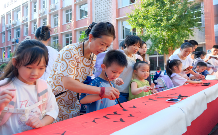 今年,内江二小延续了中国古代学童入学“开笔礼”的传统,整个仪式分为六个环节:入学门、正衣冠、拜师礼、点朱砂、写人字和击鼓明志。当天,一年级的小朋友们牵着爸爸妈妈的手,踏上红地毯走过“入学门”,跟着路牌的指引,带着兴奋喜悦的心情,充满期待地走进校园,共赴一场成长旅程。