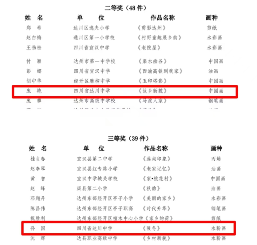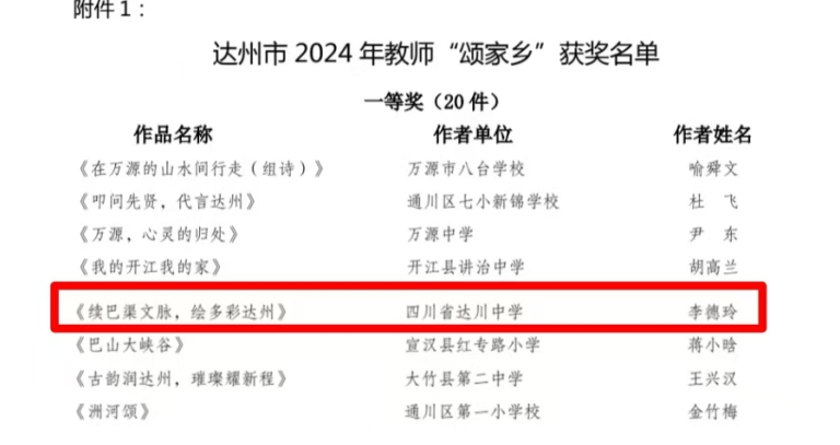 近日,达州市教育科学研究所举办了全市教师“颂家乡、唱家乡、画家乡”系列活动。达川中学共有四位老师获奖,其中,李德玲老师作品《续巴渠文脉,绘多彩达州》在“颂家乡”中荣获一等奖,李咏梅老师作品《随笔达州·诗话变迁》在“颂家乡”中获三等奖,庞艳老师中国画《故乡新貌》在“绘家乡”中获二等奖,孙国老师水粉画《暖冬》在“绘家乡”中获三等奖。