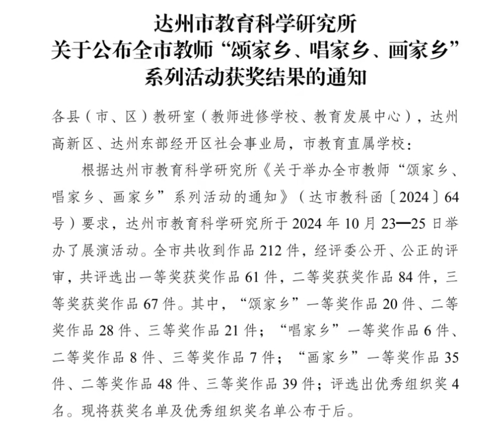 达川中学教师在全市“颂家乡、唱家乡、画家乡”系列活动中获奖