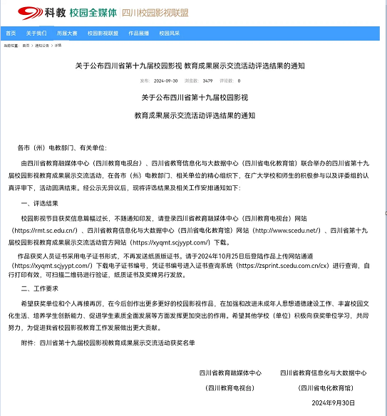 近日,四川省教育融媒体中心(四川教育电视台)、四川省教育信息化与大数据中心(四川省电化教育馆)联合举办的四川省第十九届校园影视教育成果展示交流活动评选结果公布,四川省达川中学多个参赛作品获奖。