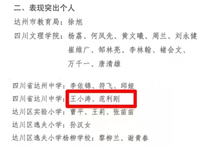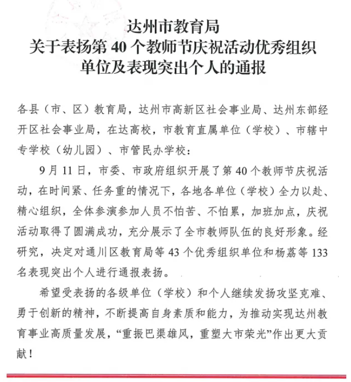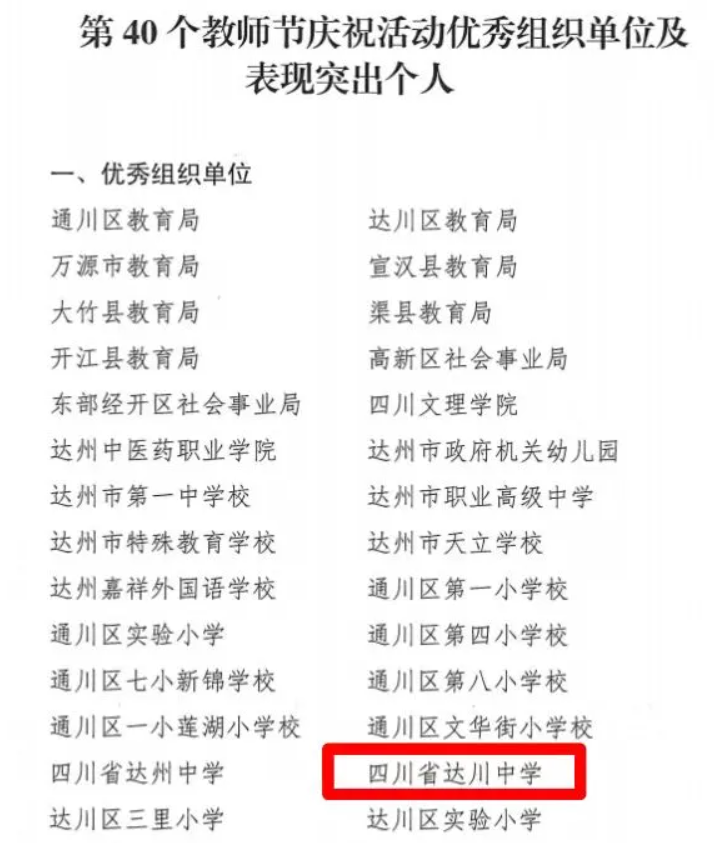 近日,达州市教育局公布关于表扬第40个教师节庆祝活动优秀组织单位及表现突出个人的通报。四川省达川中学被评为优秀组织单位,教师王小涛、范利刚被评为表现突出个人。