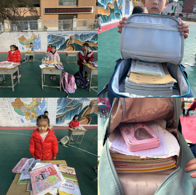 随着裁判老师的一声哨响,比赛正式拉开帷幕。参赛的小选手们,一个个精神抖擞,站在自己的书包前,仿佛即将展开一场无声的较量。书包,这个陪伴他们日日夜夜的伙伴,此刻成为了展示他们劳动技能的舞台。他们的小手忙碌而灵巧,每一样物品都被赋予了它应有的位置。书本整齐地码放在书包的最大格子里,文具盒稳稳地躺在专门的小兜里,水杯则被安全地固定在侧袋中,一切显得那么井然有序。