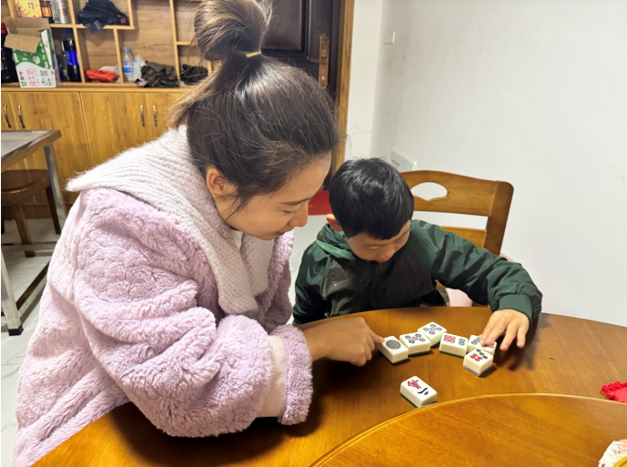 11月20日,宣汉县普光镇土主小学教师李文素、王紫涵、庹星月、冯永红等一行人,来到普光镇双河场朱孝慈的家中,开展又一轮的“送教上门”活动。冯永红老师一边用亲切的语言教朱孝慈同学认识红色和黄色,一边用手引导他把不同颜色的小圆片放到同种颜色的正方形纸片上;王紫涵教师用朱孝慈同学最喜欢的麻将作教具,教朱同学数数,认识汉字“一、二、三”;李文素老师用鸡蛋作教学具,教朱孝慈同学在桌面上揉滚鸡蛋,训练朱同学的手指的灵活度及手脑的配合协调能力;庹星月老师教朱教慈同学刷牙、穿衣等,培训他的生活处理能力……老师们不仅给朱孝慈同学送来了知识和技能,也送来了书包、作业本、文具盒、彩色笔等学习用品,并鼓励他好好学习,用彩笔绘制出自己的美好人生。