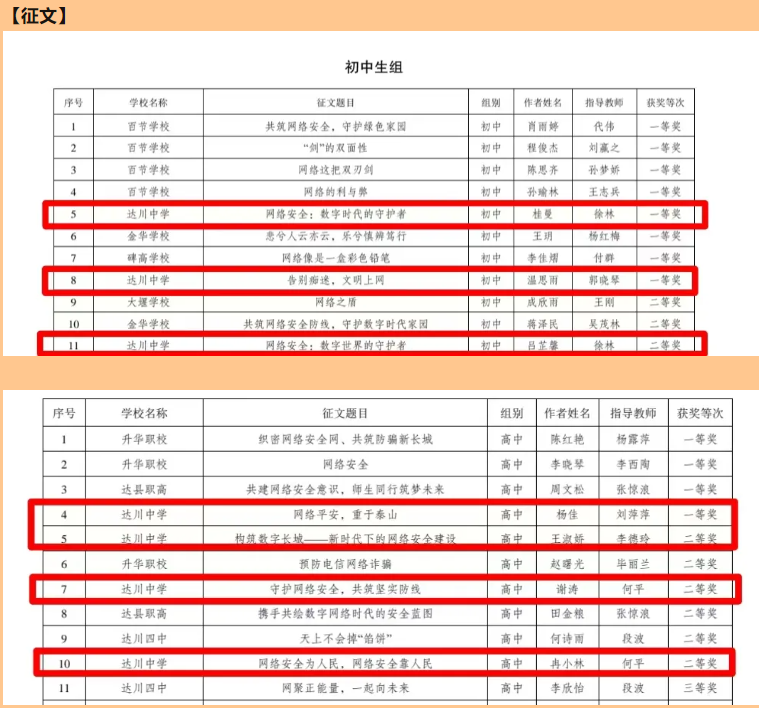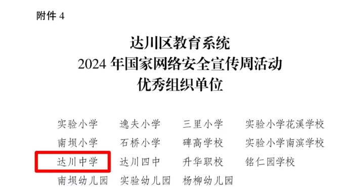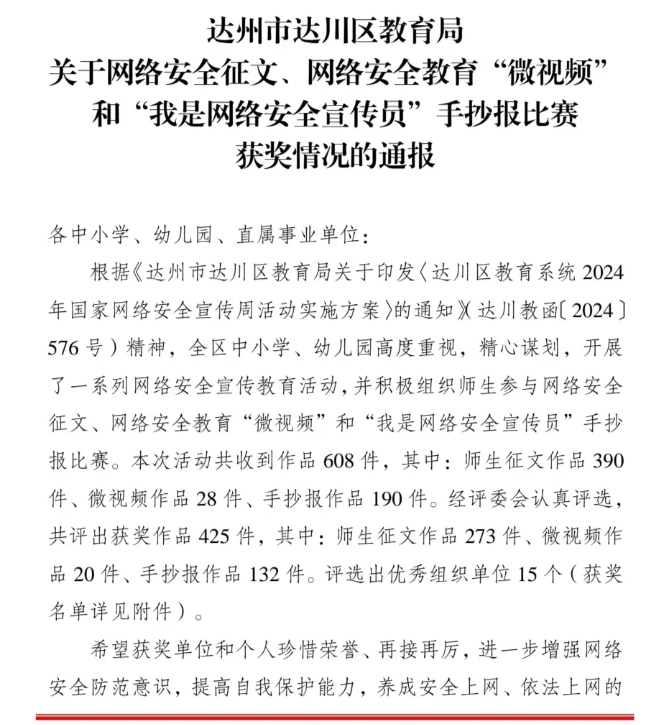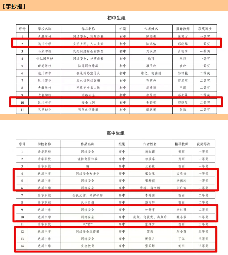 达州市达川区教育局公布关于网络安全征文、网络安全教育“微视频’和“我是网络安全宣传员”手抄报比赛获奖情况,川中学子在征文和手抄报项目中共有17人获奖,其中:7个一等奖,7个二等奖,3个三等奖,达川中学荣获优秀组织单位。
