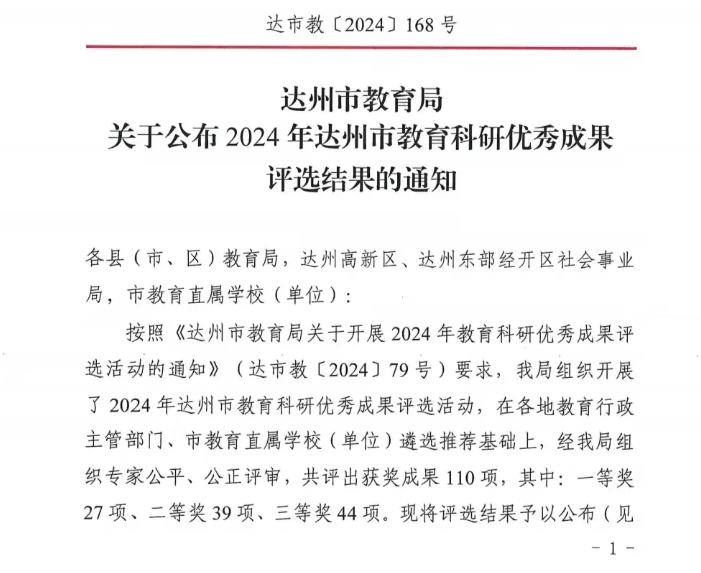 达州市教育局公布2024年达州市教育科研优秀成果评选结果,达川中学代光兵、邓智峰、周炀、谯兵、刘瑞5位老师的课题《智慧校园背景下学校管理策略构建与实施》荣获一等奖!