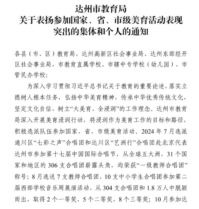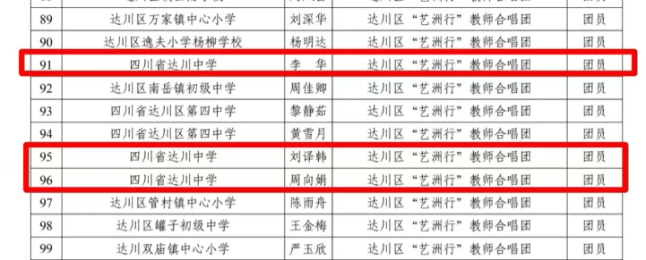 达州市教育局表扬参加国家、省、市级美育活动表现突出的集体和个人中,达川中学李华、刘译韩、周向娟3位老师荣获表扬。