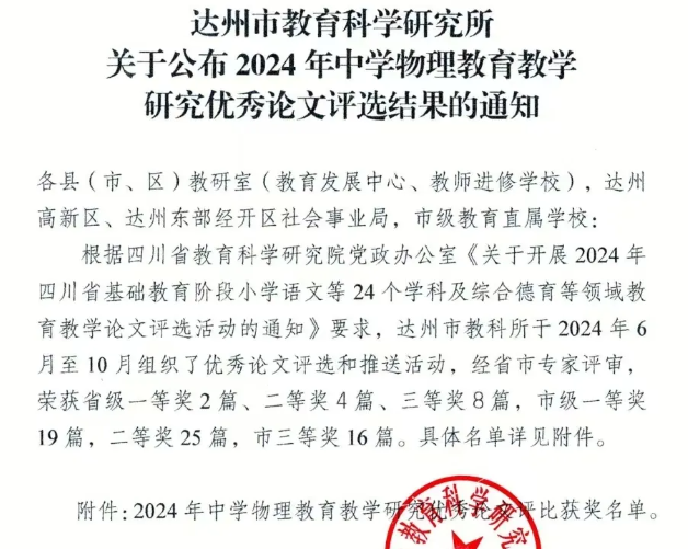 教学教研深耕耘,硕果累累满枝头。 近日,在四川省教育科学研究院公布的2024年美术、影视教育优秀论文评选结果中,达川中学孙国老师的论文《巴渠本土特色民俗校本课程的应用与实践策略》荣获二等奖。 在达州市教育科学研究所公布的2024年中学物理教育教学研究优秀论文评选结果中,达川中学何豪老师的论文《高中物理教学中学生核心素养培养的方法分析》获得高中组一等奖;刘万成老师的论文《深刻理解课程标准,探索初中教学改革》获得初中组三等奖。 祝贺以上获奖老师!这不仅是对教师个人学术能力的认可,也是达川中学教育教学质量和教师队伍素质的展示。这些荣誉是对他们教学工作和学术研究的肯定,也是对他们继续探索和创新教育教学方法的激励。