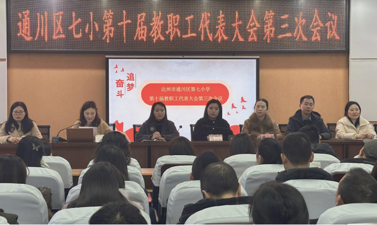 为加强学校民主管理,促进学校持续发展,2025年1月14日,通川区第七小学校第十届教职工代表大会第三次会议在四楼会议室召开。区总工会党组成员、副主席陈首宇,通川区教育工会副主席樊睿莅临指导。39名教职工代表齐聚一堂,共同为学校高质量发展建言献策。
