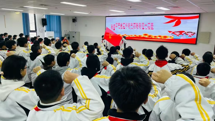 在重温入队誓词与呼号环节,队员们高举右拳,在刘力荣的带领下庄严宣誓,铿锵的“时刻准备着”响彻会场,展现出新时代少先队员的风采。