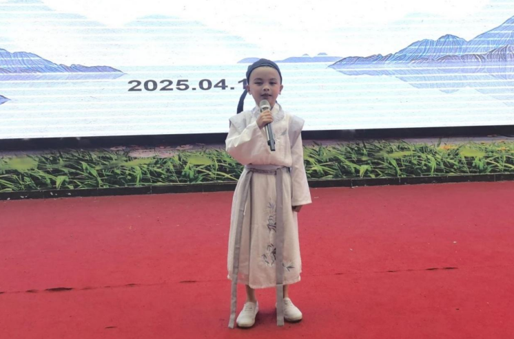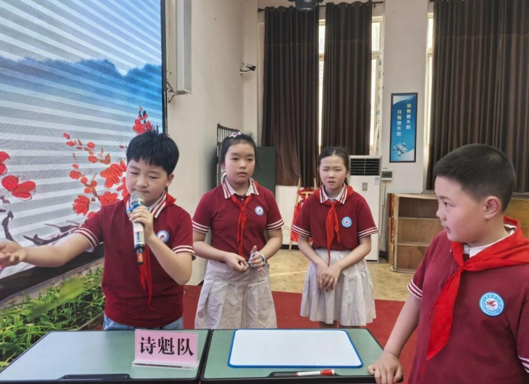 决赛在国学班的经典吟诵中拉开帷幕,衣袂翻飞间,传统文化的典雅之美直击人心。决赛分低段和中高段两个组别进行。低段选手以“个人朗诵”对决,自选《静夜思》《春晓》等五言绝句,用清脆童声演绎诗词韵律。发音的字正腔圆、情感的真挚流露、仪态的落落大方,赢得现场阵阵掌声。中高段选手分别组成“惊鸿队”、“斩月队”、“诗魁队”、“凌霄队”,以团队赛形式展开较量,必答题稳扎稳打、抢答题手速比拼、九宫格组诗考验细节、飞花令围绕“春”“江”等主题巅峰对决。尤其在“飞花令”环节,选手们妙语连珠,“春风又绿江南岸”“明月何时照我还”等诗句信手拈来,比赛高潮迭起,更是险象环生。