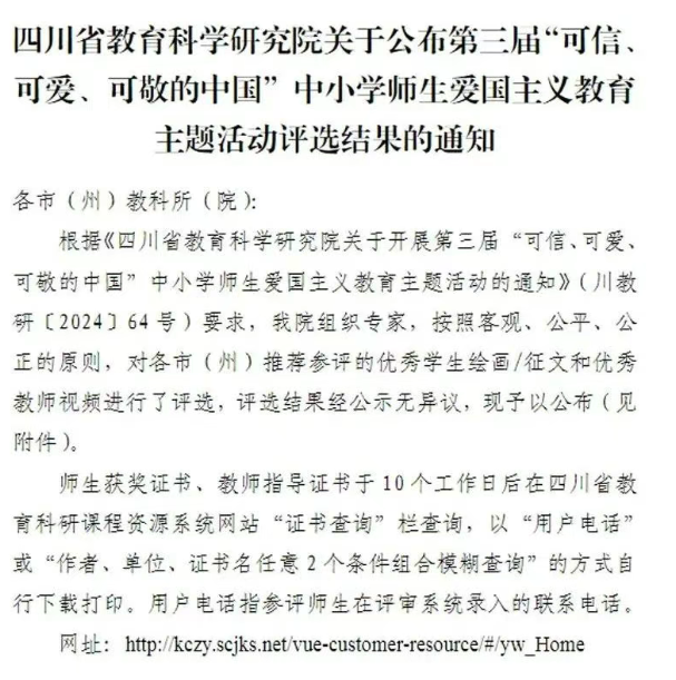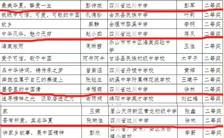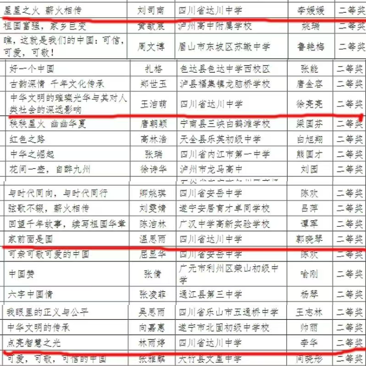在四川省教育科学研究院主办的第三届“可信、可爱、可敬的中国”中小学师生爱国主义教育主题活动中,达川中学16名学子从众多参赛者中脱颖而出,获省级特等奖3人、一等奖1人、二等奖12人,充分展示了川中学子深厚的家国情怀与综合素养。