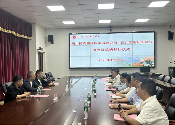近日,四川三河职业学院建筑与能源工程学院与四川民安测绘服务有限公司共建订单班签约仪式在学校第二会议室举行。四川民安测绘服务有限公司总经理王康、分管经理林立、分管经理甘晓波、学校副校长苏彬、就业指导中心主任李联春、学院党总支书记张利等领导,以及相关专业教师代表参加签约仪式,学院院长张柳金主持会议。