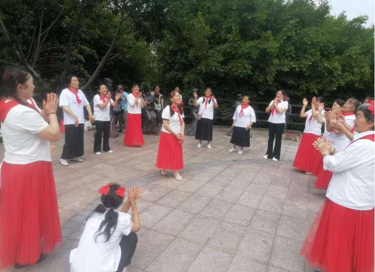 活动中,会员们佩戴鲜艳的红领巾,齐声高唱《中国少年先锋队队歌》《我们是共产主义接班人》《让我们荡起双桨》等歌曲,表演了《找朋友》《闪闪的红星》等儿童舞蹈,在忆童趣、唱儿歌、跳跳舞的环节中会员们用童趣、童歌和舞蹈表达了对党对社会主义祖国的热爱。在重玩儿时丢手绢、套圈圈等游戏的环节中,加油声、欢笑声响彻活动现场。
