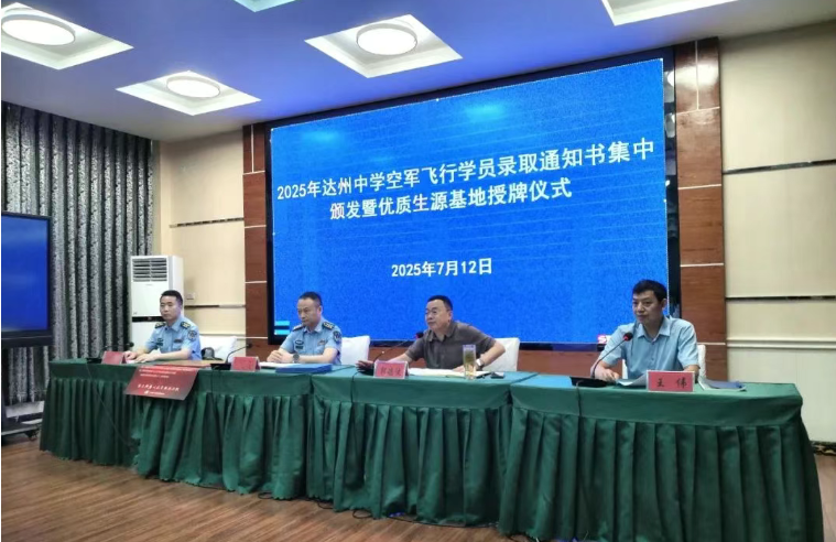 7月12日上午9时,四川省达州中学行政楼201会议室气氛庄重而热烈,2025年空军飞行学员录取通知书集中颁发暨优质生源基地授牌仪式在此隆重举行。空军招飞局成都选拔中心相关负责人,达州中学校长郭德波等领导出席仪式。仪式由达州中学副校长王伟主持。 校长致辞:育蓝天骄子,承报国使命 仪式伊始,达州中学校长郭德波代表学校全体师生对成都招飞中心相关负责人的到来表示热烈欢迎,向5名“准飞行员”致以诚挚祝贺,向支持孩子们逐梦蓝天的家长们表达衷心感谢。 喜报频传:学子终圆梦,录取创历史 随后,空军招飞局成都选拔中心相关负责人宣读录取名单,为杨景灏、杨建川、廖晨昕、孙回龙、谢雨豪五位“准飞行员”逐一颁发录取通知书,并代表选拔中心向达州中学赠送喜报,正式授予“空军飞行学员优质生源基地”牌匾。 学子心声:以青春之名,赴蓝天之约 学生代表杨建川发言时难掩激动。他感谢招飞中心的悉心指导与母校的培育,表示学校浓郁的招飞氛围点燃了自己的蓝天梦想,老师们的系统指导助其闯过层层关卡。他回顾了与43班同学共同奋斗的青春时光,鼓励学弟学妹们以奋斗姿态追逐理想,踊跃报考空军飞行学员。他承诺将以录取为新起点,刻苦训练,为国防事业贡献力量,不负母校与祖国的期望。 殷切嘱托:负神圣使命,翱翔新时代 空军招飞局成都选拔中心相关负责人在讲话中高度肯定达州中学的招飞工作,并指出,达州中学以强烈的使命感推动招飞工作,在宣传发动、生源选送等方面成效显著,近年来已输送10余名飞行学员。今年5名学子被录取,人数居全省普通高中首位,其中杨景灏同学有望入围“双学籍培养”,录取质量创历史新高,充分彰显了“空军飞行学员优质生源基地”的实力。 仪式最后,全体参会人员合影留念,定格这一荣耀时刻。此次活动不仅是对达州中学育人成果的肯定,更激励着广大学子树立报国理想,为国防事业注入青春力量。达州中学将以此次授牌为契机,持续深化国防教育,为国家输送更多蓝天卫士,为空军转型建设贡献更大力量。