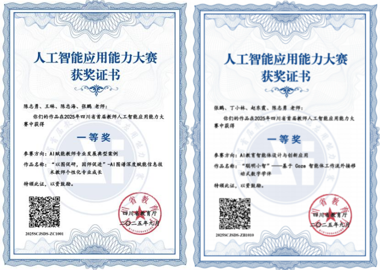 近日,四川省首届教师人工智能应用能力大赛结果公布,四川三河职业学院通识教育学院陈志勇团队与张鹏团队报送的参赛作品从全省众多参赛作品中脱颖而出,双双获省级一等奖,充分展现了学校在人工智能教育教学领域的教学实力。