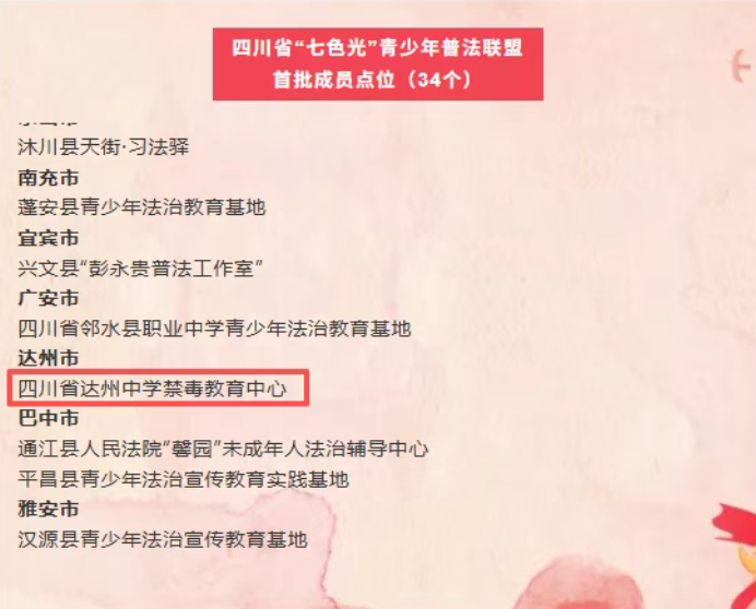 祝贺!达州中学禁毒教育中心获评四川省“七色光”青少年普法联盟首批成员点位
