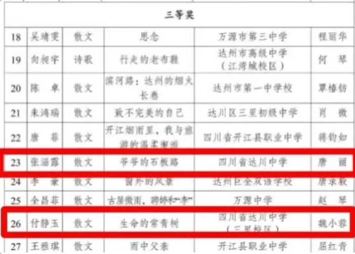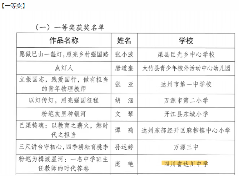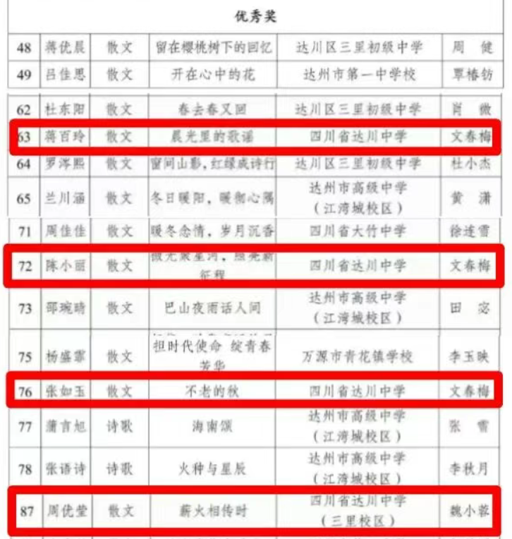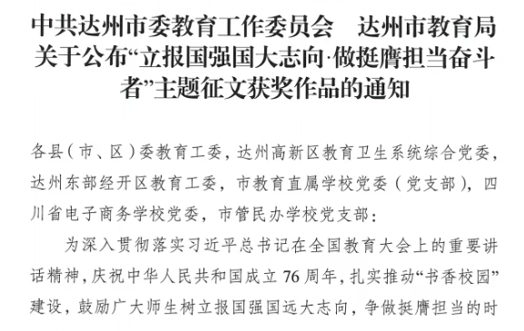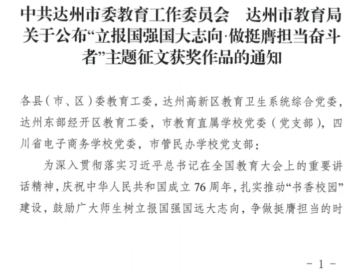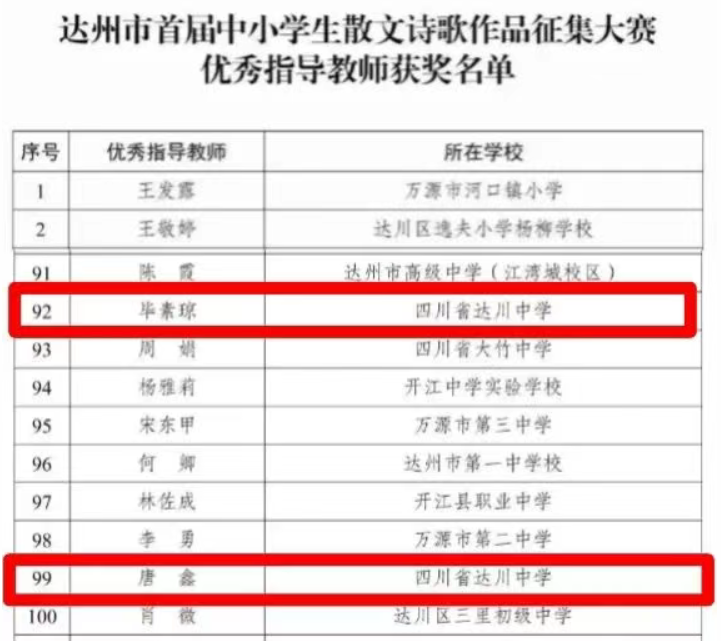 硕果盈枝缀满园,捷报频传奏凯歌! 在这个洋溢着收获与喜悦的季节里,我们怀着无比激动的心情,向全体师生、家长以及长期关心支持达川中学发展的社会各界人士报喜! 近日,从国家、市、区各级各类作品征集活动接连传来佳音,达川中学师生凭借出色的才华、独特的创意与不懈的努力,一路“披金斩银”,成绩斐然,捷报频传! 无论是文学创作的锦绣篇章,还是艺术创作的匠心硕果,都得到了评委专家们的高度认可,充分展现了达川中学师生卓越的综合素养与昂扬的精神风貌。 【一】 西南林业大学承办的第五届“智华杯”全国艺术作品竞赛最近公布了获奖作品,川中学子书法作品在众多参赛作品中脱颖而出,其中:作品《风度山横联》斩获银奖,《题邓爱慕》、杜牧《江南春》两件作品喜获佳作奖,赵庭老师荣获“优秀指导教师”。 祝贺以上获奖师生!让我们一同为学子们的才华喝彩,也祝愿同学们在艺术熏陶中汲取向上的力量! 【二】 达州市首届中小学生最美散文、诗歌作品征集大赛近日公布了获奖名单,达川中学共有10件作品获奖,其中,一等奖1个,二等奖1个,三等奖2个,优秀奖4个,入围奖2个,毕素琼、唐鑫、唐丽、文春梅四位老师获得“优秀指导教师”称号,达川中学获得“优秀组织单位”。 据悉,本次活动由四川文理学院、达州市关心下一代工作委员会、达州市教育局、共青团达州市委、达州市融媒体中心主办,由巴山作家群研究院、四川省青少年文学艺术社科普及基地、达州晚报教育周刊、达州市达报教育管理有限公司承办,旨在发展我市校园散文诗歌文化,传承弘扬我市优秀传统文化,进一步选拔和培养优秀文学人才,提升我市青少年文化艺术水平。活动开展以来,川中学子热情参与,积极投稿,取得了良好的成绩。在此向所有获奖同学致以最热烈的祝贺!也向辛勤指导的老师表示衷心感谢! 诗心不熄,创作不止。期待更多川中学子提笔书写属于你们的璀璨篇章! 【三】 在中共达州市委教育工作委员会和达州市教育局组织的“立报国强国大志向,做挺膺担当奋斗者”主题征文比赛活动中,达川中学共有6名师生获奖,其中,庞智蔓、周优莹、郑晶嫣三位同学的作品分别获得了优秀奖,庞艳老师的《粉笔为楫渡星河:一名中学班主任教师的时代答卷》获得一等奖,何春梅老师的《鹰扬万里凌云际,志报家国正当时》获得二等奖,唐娅老师的《指尖上的红色旋律:在达州红土奏响育人华章》获得优秀奖。 【教师组】 祝贺获奖老师和同学! 字字见肝胆,篇篇显风华。川中人用笔书写祖国的精彩篇章,用行动践行“强国有我” 的铮铮誓言! 【四】 达州市达川区教育局等4部门公布了关于“颂优美环境 展老区新貌”征文大赛评奖结果,达川中学有4件学生作品获得优秀奖,学校在本次活动中也获得优秀组织奖。 祝贺以上获奖同学!你们用真情实感表达的不仅仅是对老区新貌的赞美,亦是浓浓的家国情怀与民族自豪感! 老家达县,宜美达川。青山绿水风光好,还历史悠久、底蕴深厚,在新时代焕发新气象。 这些沉甸甸的荣誉,是同学们勤学苦练的智慧结晶,是老师们悉心指导的丰硕成果,更是达川中学坚持“五育并举”、全面育人的生动体现!