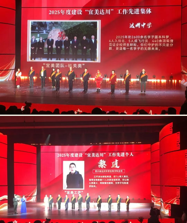 1月31日,2025年“宜美达川”成果汇报会在巴山大剧院盛大开演。达州中学获评2025年度建设“宜美达川”工作先进集体,达州中学黎逍老师荣获2025年度建设“宜美达川”工作先进个人。