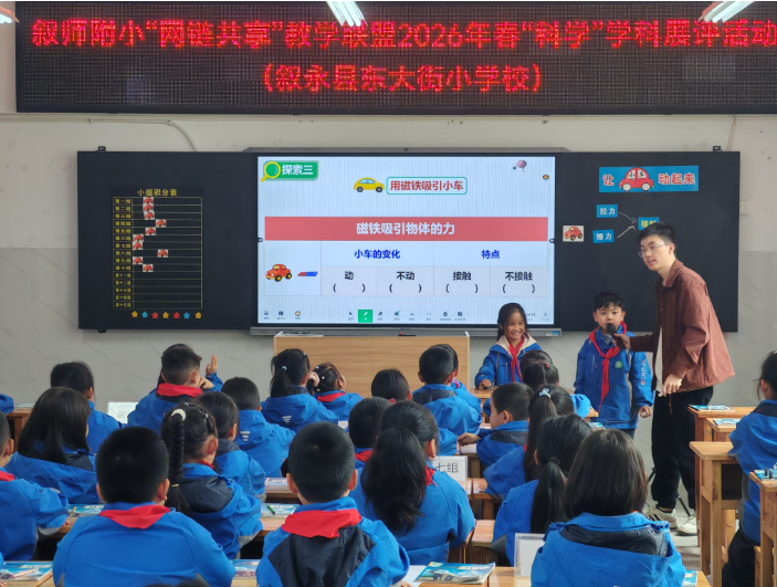 3月30日,叙永县叙师附小“网链共享” 教学联盟科学学科赛课活动在叙永镇东大街小学顺利举行,本次赛课以二年级《让小车动起来》为统一课题,来自东大街小学、视槽中心校、观兴中心校、银顶小学、叙师附小的 5位科学教师同台竞技,将探究实践融入课堂,生动展现了新课标下科学课堂的活力与魅力。