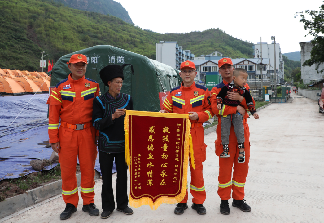“谢谢两位恩人的救命之恩,我们一家永远不会忘记你们!”2021年5月11日,家住马边彝族自治县荣丁镇解放街社区的模西宇飞及其家人,将一面锦旗送到了救命恩人--贵州省消防救援总队贵阳支队地震救援队队员李世超、郭又元的手中。